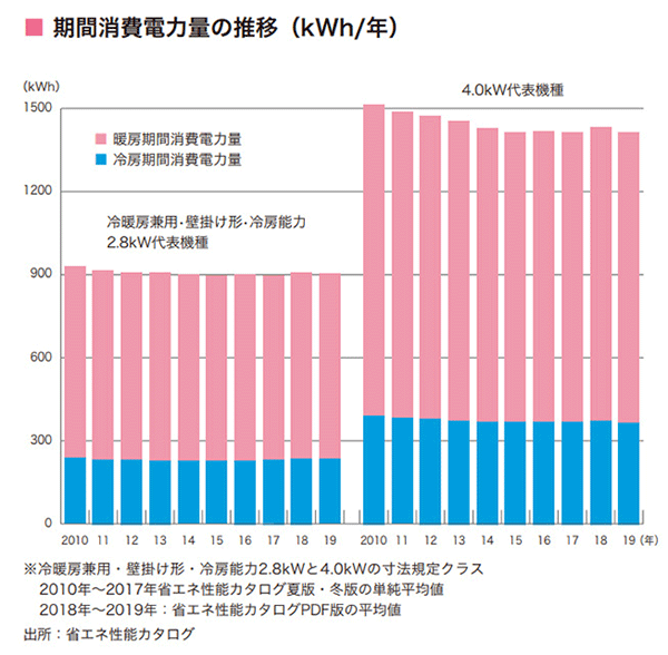 エアコンの期間消費電力量は毎年少しずつ下がっていますが、2010年からはほぼ横ばいを続けており、10年前のエアコンと比べても省エネ性能に大きな違いはありません。