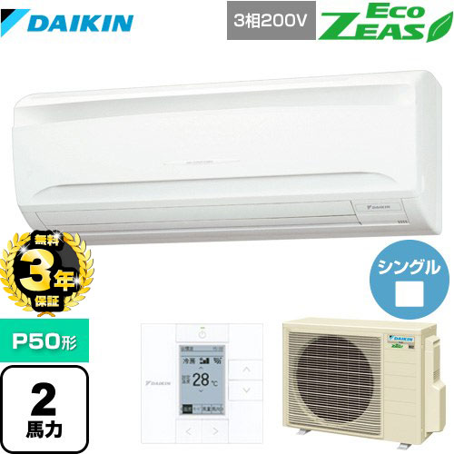 | 仕様・ 特徴 | 店舗・オフィス用エアコン「スカイエア」大容量クラスもラインアップのスタンダードモデル。 壁掛形 P50形 2馬力相当 ペア(シングル) 三相200V ワイヤードリモコン 冷房能力:4.5(2.1~5.0)kW 暖房能力:5.0(2.3~6.3)kW 新冷媒R32 |