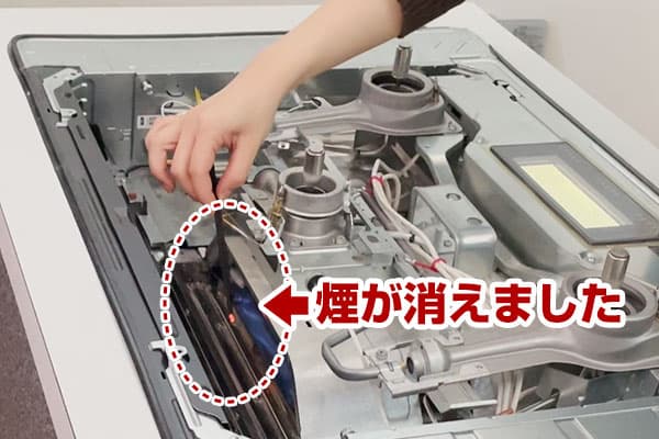 グリル奥のバーナーに線香を近づけて、実際に煙が消える様子を見ることができた時には、スタッフ一同「おお~!」っと声をあげるほど驚きました。