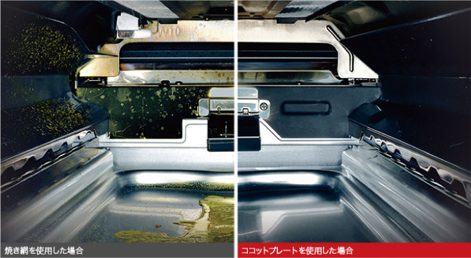 ココットプレートを使えばグリル庫内への油汚れを99.9%カット!後片づけの面倒がなく、ニオイも広がりにくいから、気軽にグリル料理を楽しめます。(ココットプレートは別売り)