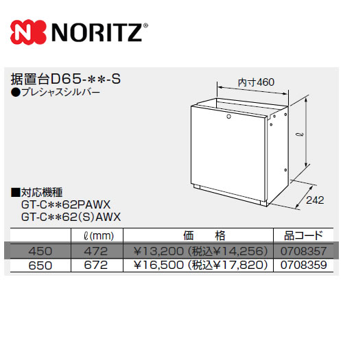 ノーリツ ガス給湯器部材 据置台 サイズ:W460×D242×H672 プレシャスシルバー ≪D65-650-S≫【送料無料】