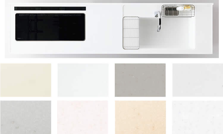 ワークトップは人気の素材、人造大理石が標準。扉カラー、シンクとのデザインコーディネートの幅が広がります。※PaPaPaシンクの場合、シンクとカウンターが一体成型のため同色になります。